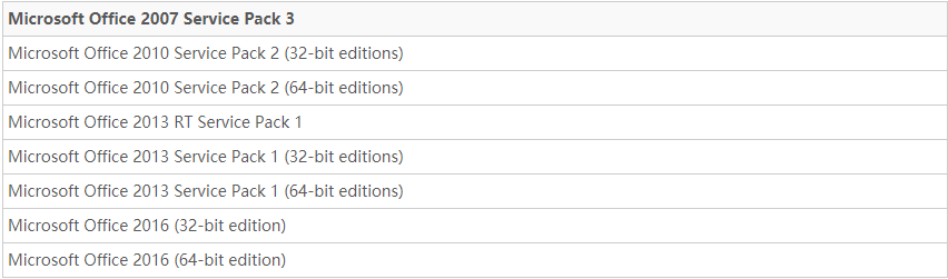 Windows系统补丁大多会被正常安装,但Office的补丁是否能正常安装取决于当前的版本,微软在安全通报中所列的可打补丁的Office版本如下: