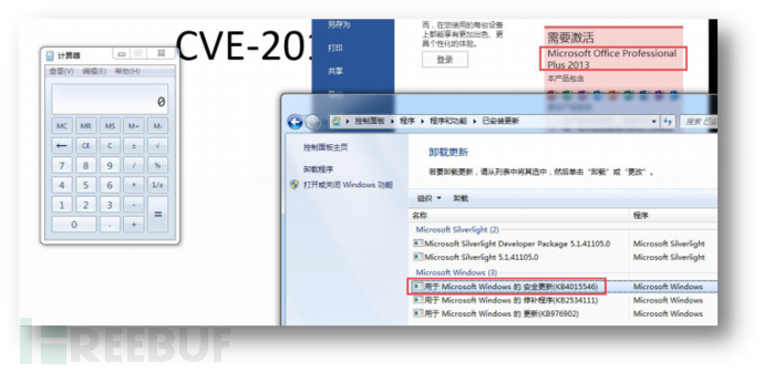 上例Office 2013 Pro Plus没有在微软给出的受影响版本中(补丁给的是Microsoft Office 2013 Service Pack 1),所以不能成功安装mso补丁,只安装了ole部分的补丁,两个补丁缺少一个漏洞可以成功利用。
