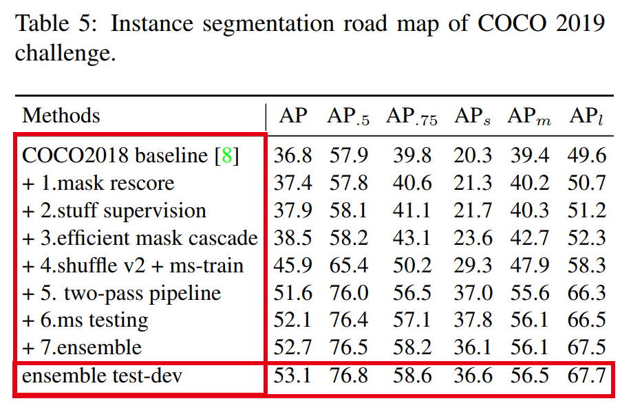 在COCO-2019检测/实例分割 test-dev数据集上,我们的系统达到61.0 / 53.1 mAP,比我们2018年的获胜结果分别高出5.0 / 4.2。
