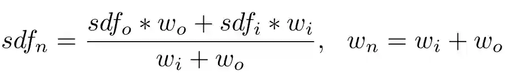 2.1.TSDF表达:3D点映射为到最近表面的距离,记为符号距离函数(SDF)。深度观察使用投影映射方式集成,投影距离和深度地图值的插值记为表面距离d,并且被融合到TSDF域:
