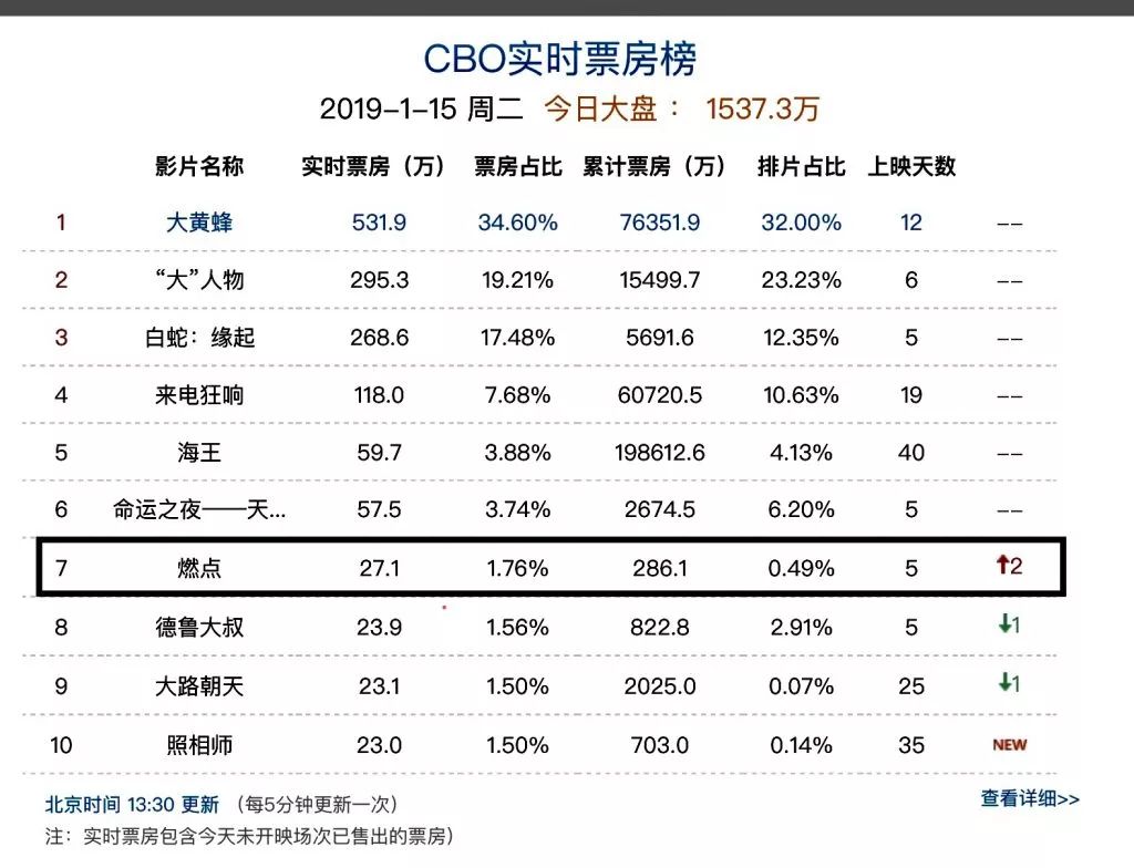 根据 CBO 实时票房榜数据,国内首部创业纪实电影《燃点》截止 1 月 15 日 13时累计票房仅为 286.1 万元,比起同期上映的三部电影的累计票房:5691.6 万(《白蛇:缘起》)、2674.5 万(《命运之夜—天之杯:恶兆之花》)、822.8 万(《德鲁大叔》),该电影在国内电影市场上并未“燃”起来。