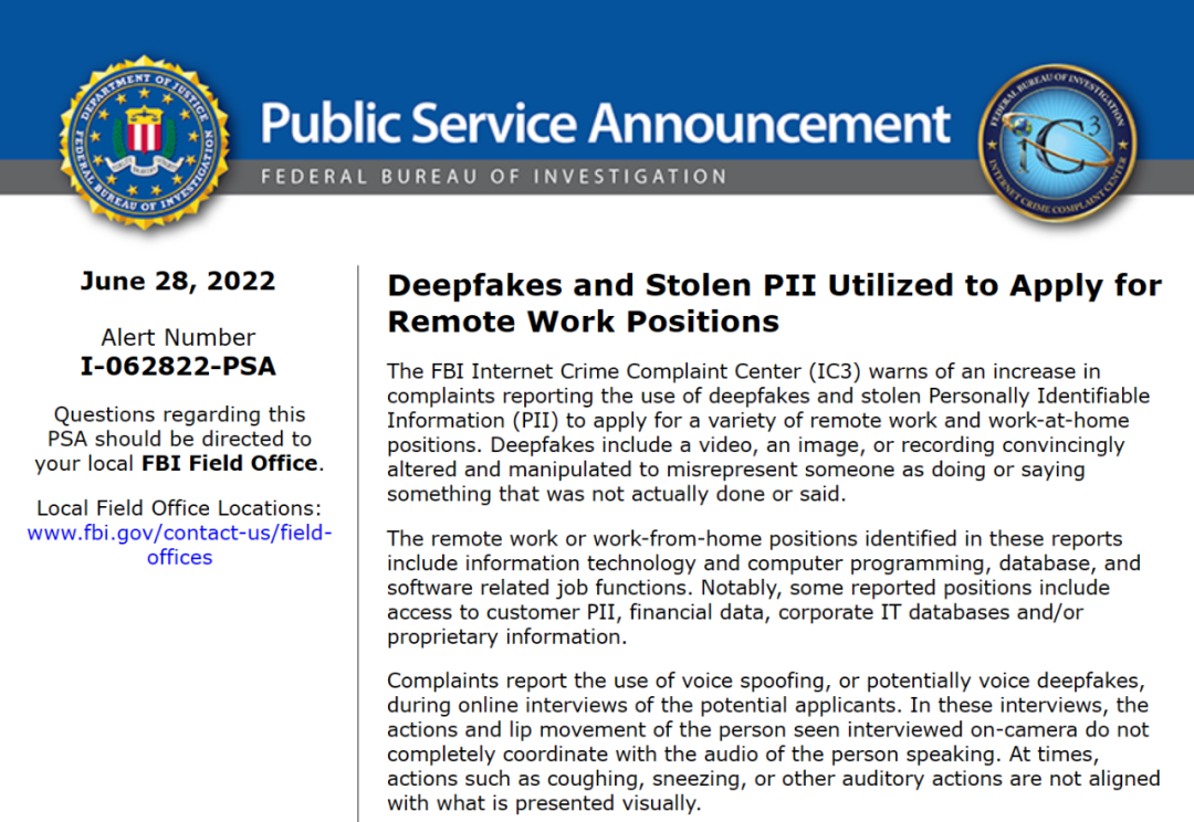 近日,根据外媒 pcmag 报道,FBI 表示有诈骗者一直使用 Deepfake 技术在远程工作的面试中冒充求职者,试图谋得 IT 公司的工作机会,以访问它们的客户或财务数据、企业 IT 数据库和 / 或专有信息。