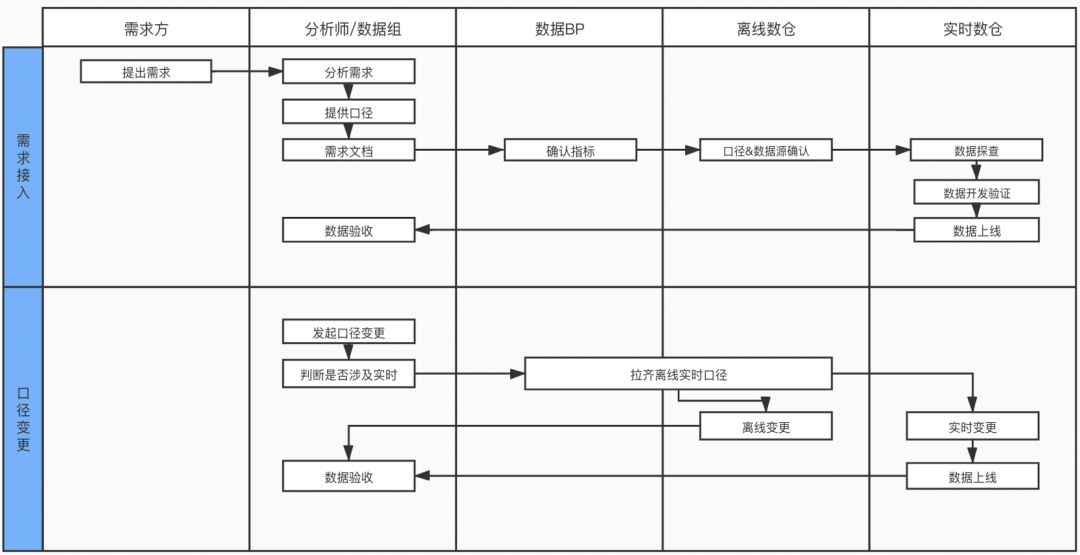 口径变更--业务方发起:业务方发起口径变更,判断是否涉及到实时指标,数仓BP对离线和实时口径进行拉齐,向离线数仓团队和实时数仓团队提供更口口径和数据源表,实时数仓团队先上测试看板,验收通过后切换到正式看板