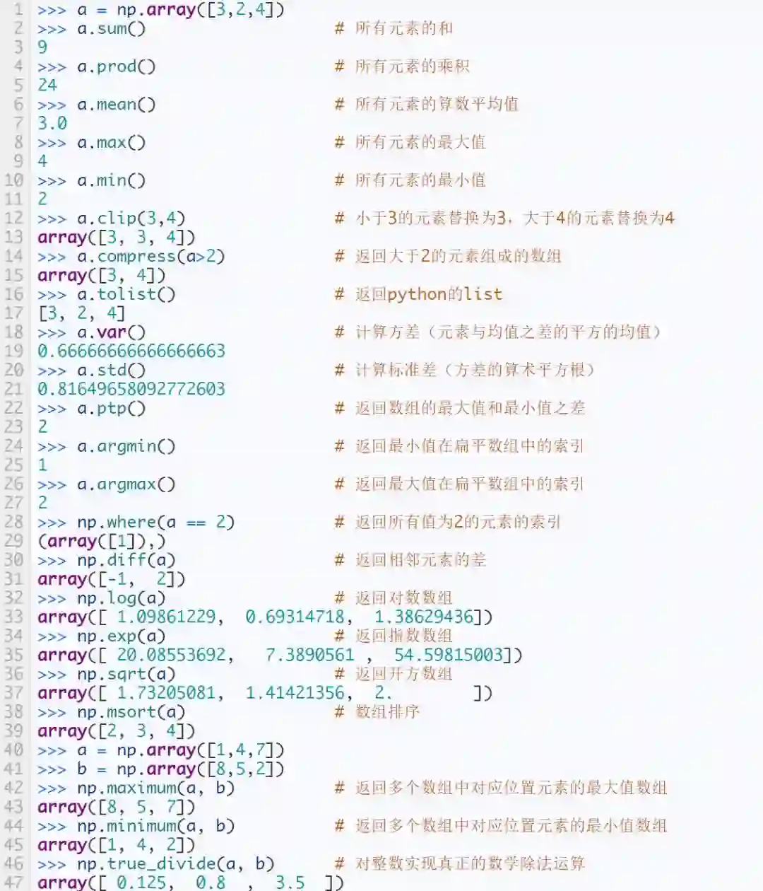 数组对象本身提供了计算算数平均值、求最大最小值等内置方法,numpy也提供了很多实用的函数。为了缩减篇幅,下面的代码仅以一维数组为例,展示了这些方法和函数用法。事实上,大多数情况下这些方法和函数对于多维数组同样有效,只有少数例外,比如compress函数。
