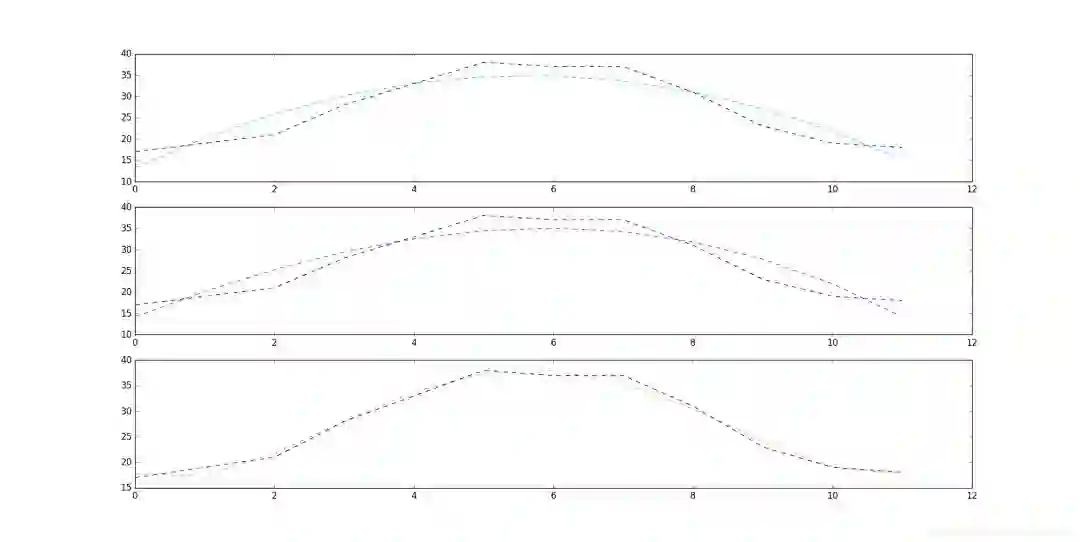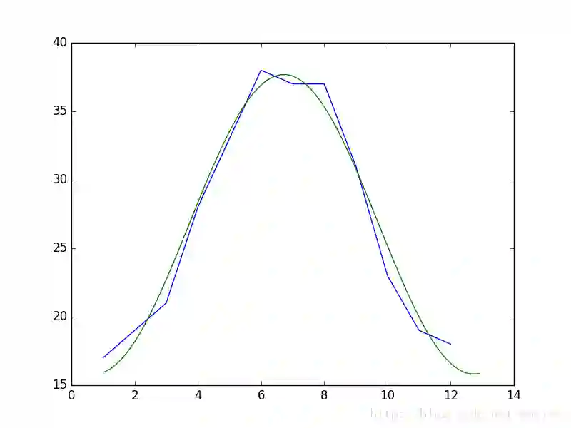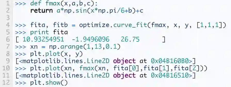 可以看出,曲线近似正弦函数。构建函数y=a*sin(x*pi/6+b)+c,使用scipy的optimize.curve_fit函数求出a、b、c的值: