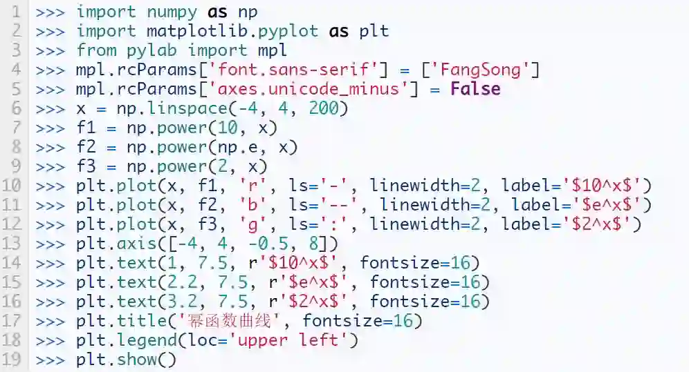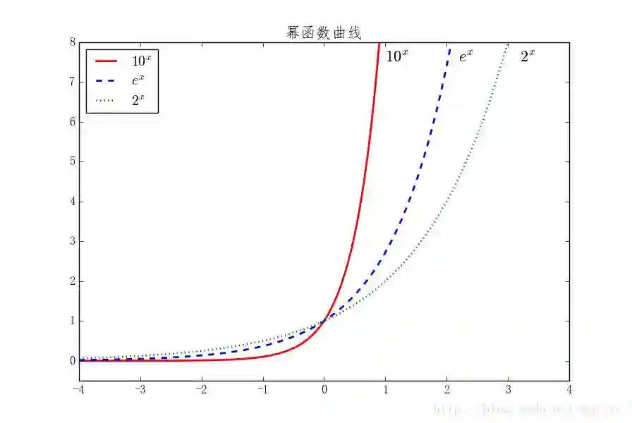 我们分别使用不同的线型、颜色来绘制以10、e、2为基的一组幂函数曲线,演示文本标注和图例的使用。