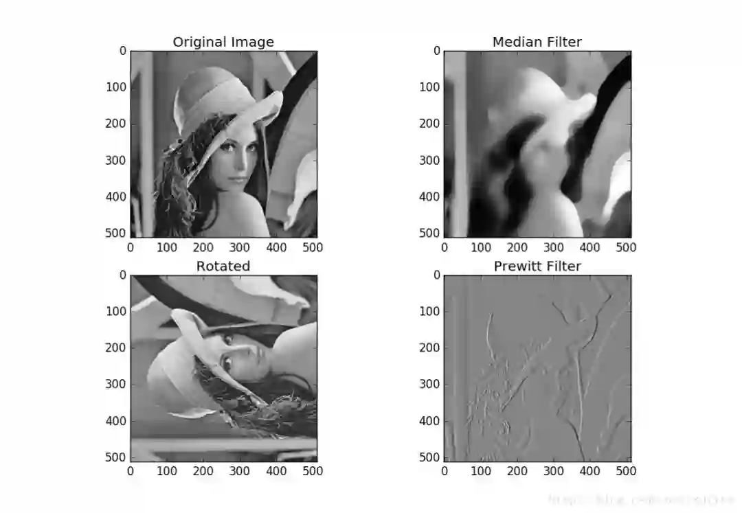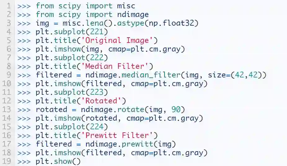 在scipy.misc模块中,有一个函数可以载入Lena图像——这副图像是被用作图像处理的经典示范图像。我只是简单展示一下在该图像上的几个操作。