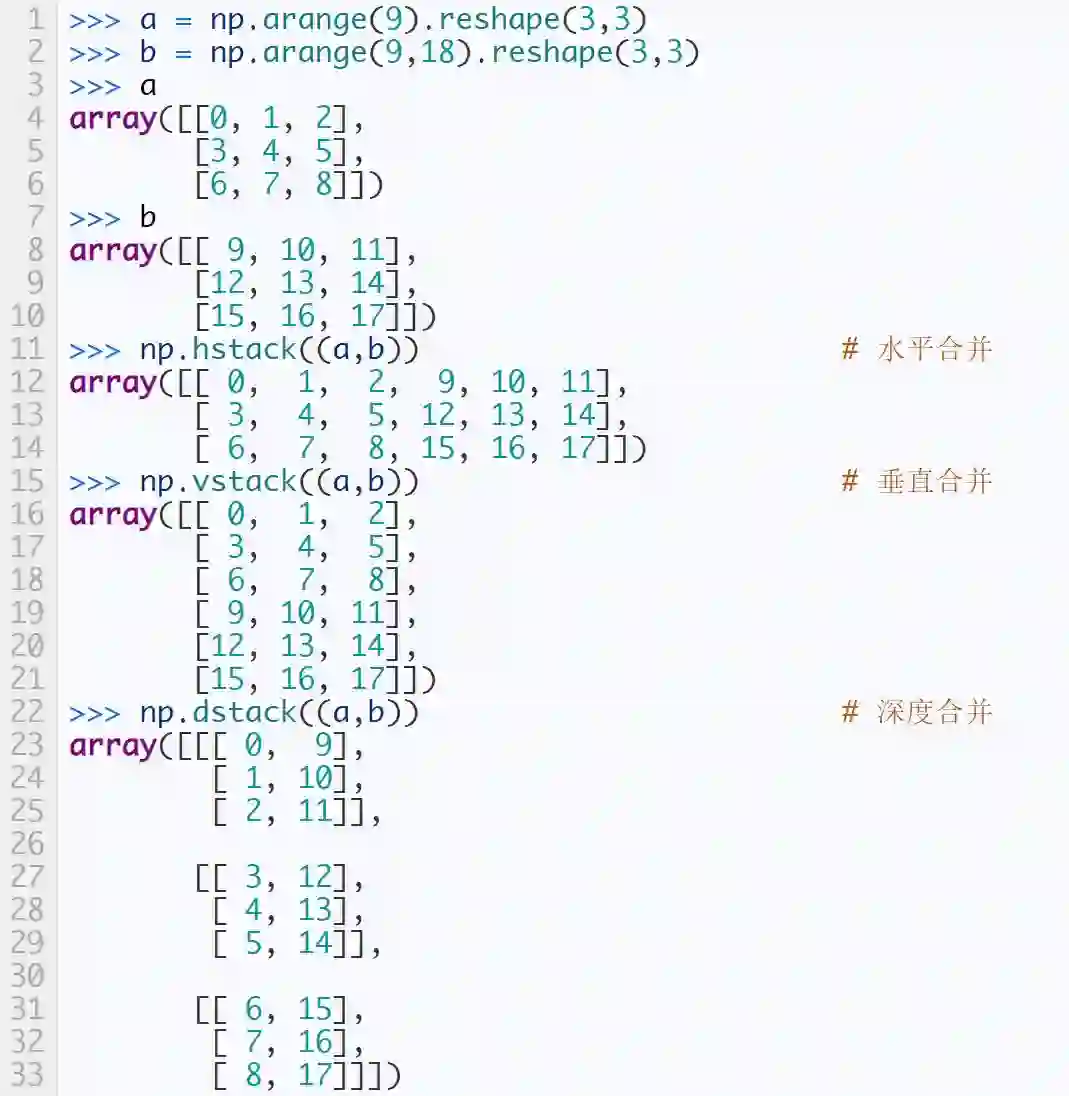 数组合并除了下面介绍的水平合并、垂直合并、深度合并外,还有行合并、列合并,以及concatenate()等方式。假如你比我还懒,那就只了解前三种方法吧,足够用了。