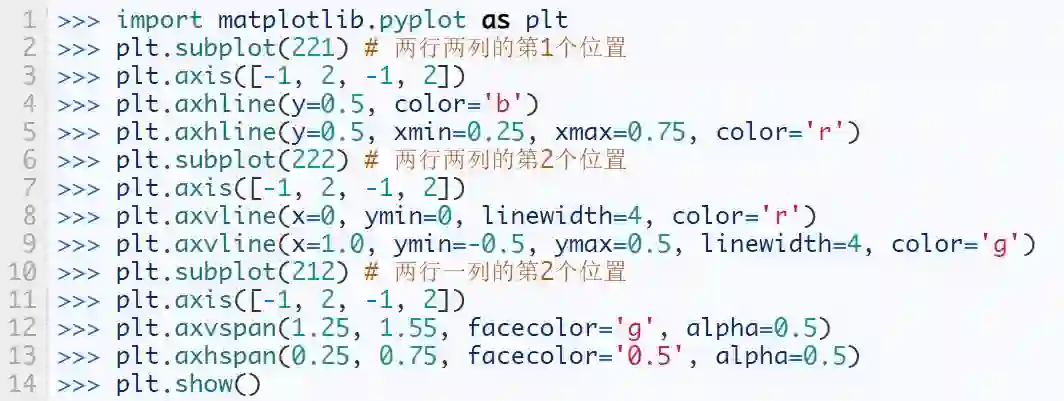 在介绍如何将多幅子图绘制在同一画板的同时,顺便演示如何绘制直线和矩形。我们可以使用subplot函数快速绘制有多个轴的图表。subplot函数的调用形式如下: