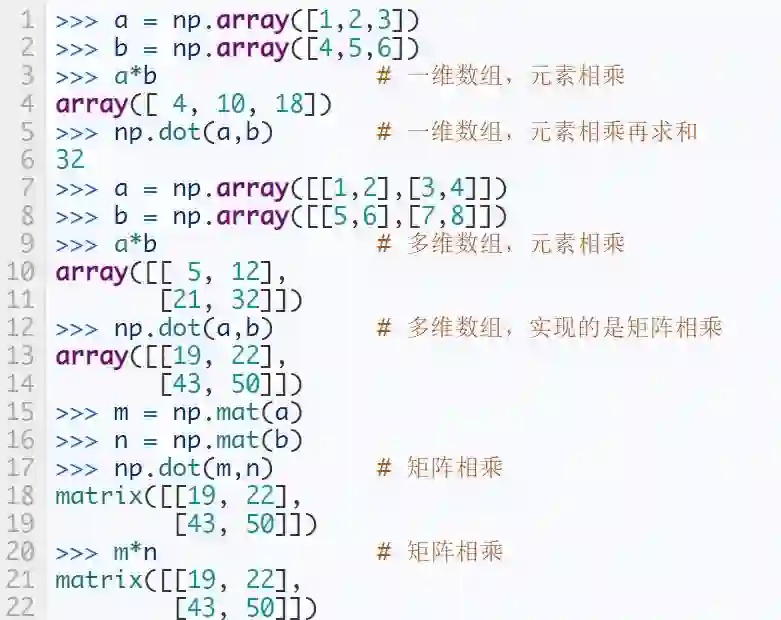 对ndarray对象而言,星号是按元素相乘,dot()函数则当作矩阵相乘。对于matrix对象来说,星号和dot()函数都是矩阵相乘。特别的,对于一维数组,dot()函数实现的是向量点乘(结果是标量),但星号实现的却不是差乘。