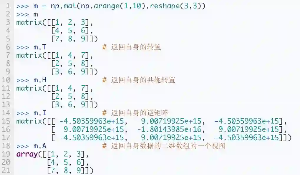 matrix是矩阵对象,继承自ndarray类型,因此含有ndarray的所有数据属性和方法。不过,当你把矩阵对象当数组操作时,需要注意以下几点: