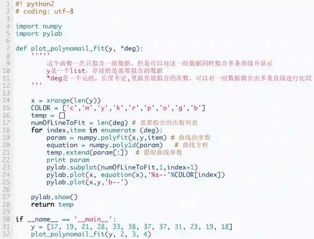 下面这段代码,基于Numpy模块,可以直接绘制出拟合曲线,但我无法得到曲线方程(尽管输出了一堆曲线参数)。这是一个值得继续深入研究的问题。