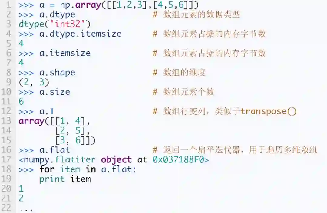 numpy的数组对象除了一些常规的属性外,也有几个类似转置、扁平迭代器等看起来更像是方法的属性。扁平迭代器也许是遍历多维数组的一个简明方法,下面的代码给出了一个例子。