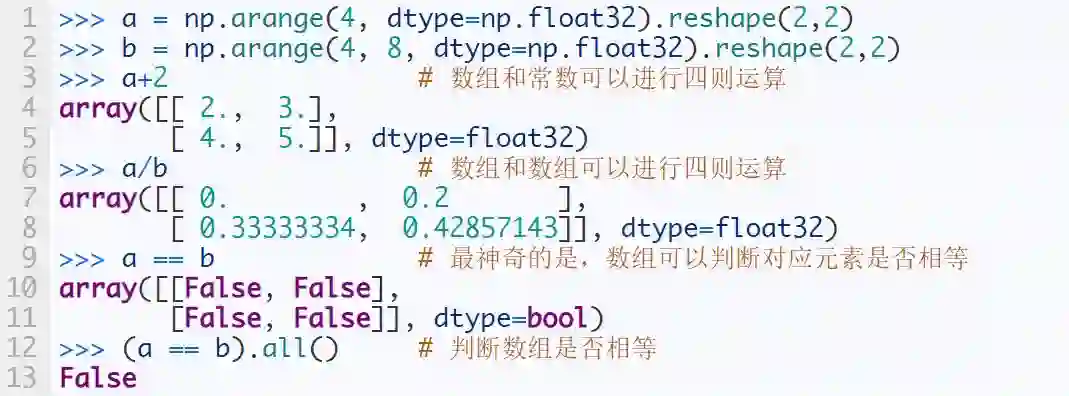 数组和常数的四则运算,是数组的每一个元素分别和常数运算;数组和数组的四则运算则是两个数组对应元素的运算(两个数组有相同的shape,否则抛出异常)。