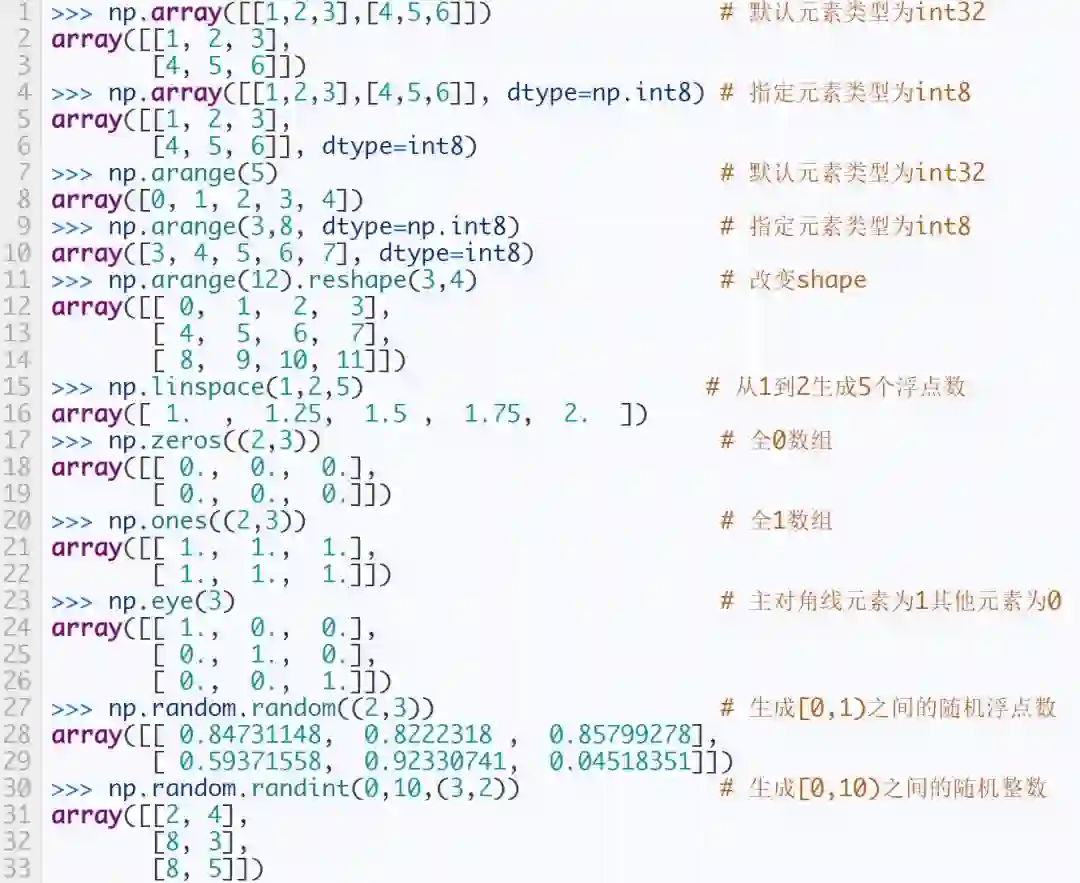通常,我们用np.array()创建数组。如果仅仅是创建一维数组,也可以使用np.arange()或者np.linspace()的方法。np.zeros()、np.ones()、np.eye()则可以构造特殊的数据。np.random.randint()和np.random.random()则可以构造随机数数组。