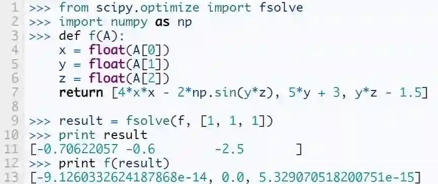在数学建模中,需要对一些稀奇古怪的方程(组)求解,Matlab自然是首选,但Matlab不是免费的,scipy则为我们提供了免费的午餐!scipy.optimize库中的fsolve函数可以用来对非线性方程(组)进行求解。它的基本调用形式如下: