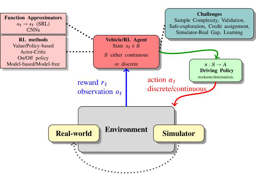 [1] A Survey of Deep Learning Applications to Autonomous Vehicle Control: https://ieeexplore.ieee.org/abstract/document/8951131?casa_token=fwUZxwU0Eo8AAAAA:B[2] End-to-End Deep Reinforcement Learning for Lane Keeping Assist:https://arxiv.org/abs/1612.04340[3] Deep Reinforcement Learning framework for Autonomous Driving:https://www.ingentaconnect.com/content/ist/ei/2017/00002017/00000019/art00012[4] A Reinforcement Learning Based Approach for Automated Lane Change Maneuvers:https://ieeexplore.ieee.org/abstract/document/8500556?casa_token=OcyB7gHOxcAAAAAA:JrwO6[5] Formulation of deep reinforcement learning architecture toward autonomous driving for on-ramp merge:https://ieeexplore.ieee.org/abstract/document/8317735?casa_token=HaEyBLwaSU0AAAAA:5[6] A Multiple-Goal Reinforcement Learning Method for Complex Vehicle Overtaking Maneuvers:https://ieeexplore.ieee.org/abstract/document/5710424?casa_token=Y-bJbe3K9r0AAAAA:ZNo[7] Navigating Occluded Intersections with Autonomous Vehicles Using Deep Reinforcement Learning:https://ieeexplore.ieee.org/abstract/document/8461233?casa_token=uuC5uVdLp60AAAAA:6fr7[8] Reinforcement Learning with A* and a Deep Heuristic:https://arxiv.org/abs/1811.07745[9] CARLA: An Open Urban Driving Simulator:https://proceedings.mlr.press/v78/dosovitskiy17a.html[10] TORCS - The Open Racing Car Simulator:https://sourceforge.net/projects/torcs/[11] MADRaS Multi-Agent DRiving Simulato:https://www.opensourceagenda.com/projects/madras[12] Microscopic Traffic Simulation using SUMO:https://ieeexplore.ieee.org/abstract/document/8569938?casa_token=1z4z-bT6kTsAAAAA:BdTO6tJB4xEgr_EO0CPveWlForEQHJWyprok3uyy3DssqzT-7Eh-pr7H__3DOJPDdpuIVUr7Lw[13] Flow: Architecture and Benchmarking for Reinforcement Learning in Traffic Control:https://www.researchgate.net/profile/Abdul-Rahman-Kreidieh/publication/320441979_Flow_Archite[14] A Collection of Environments for Autonomous Driving and Tactical Decision-Making Tasks:https://github.com/eleurent/highway-env