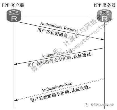 (1)发起PPP连接的客户端(被认证方)首先以明文方式向PPP服务器端发送一个认证请求(Authenticate-Request)帧,其中就包括用于身份认证的用户名和密码;