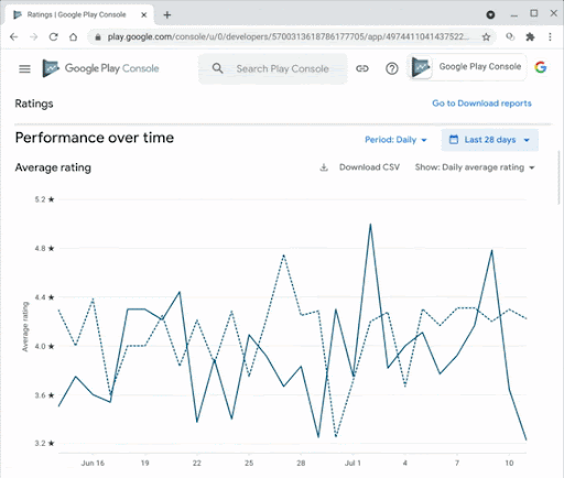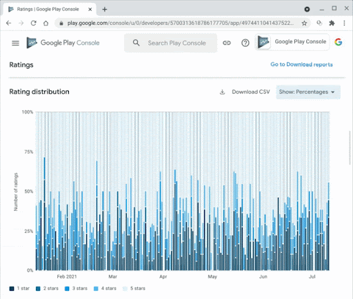 我们还支持以 CSV 格式下载您应用的平均数据和评分分布。结合全新的数据过滤选项,您可以轻松查询和下载更多数据,并进行离线分析。例如,您可以下载每日评分分布的完整历史记录,并在表格中将其与客户服务相关联。