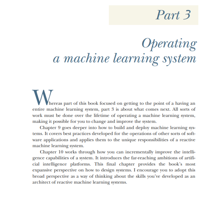 本书的一部分着重于拥有一个完整的机器学习系统,而第3部分则是接下来的内容。在运行机器学习系统的整个生命周期中,必须完成各种工作,以便您可以更改和改进系统。