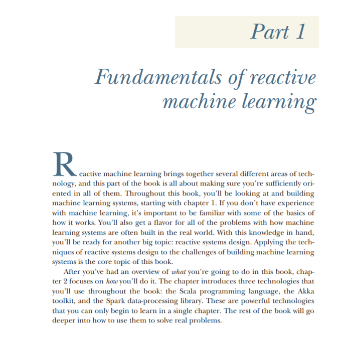 响应式机器学习汇集了几个不同的技术领域,而本书的这一部分旨在确保您对所有这些领域都有足够的了解。从第一章开始,您将在整本书中研究和构建机器学习系统。如果您没有机器学习的经验,那么一定要熟悉它的工作原理。您还将了解现实世界中通常如何构建机器学习系统的所有问题。掌握了这些知识之后,您就可以准备应对另一个重要的话题:反应式系统设计。将反应性系统设计技术应用于构建机器学习系统的挑战是本书的核心主题。
