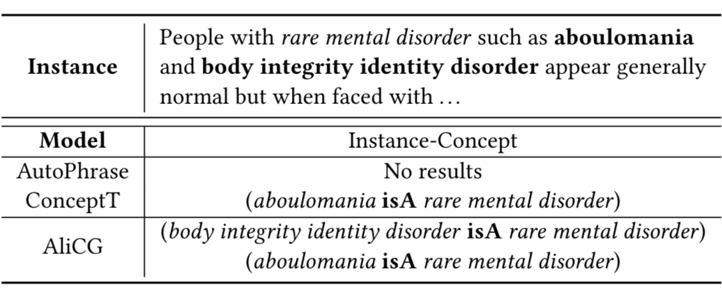 我们对概念图谱构建系统和应用做了丰富的实验。如下图所示,实验结果表明,相比于传统的概念挖掘算法,我们能够获得更加细粒度的概念实例三元组,且具备对长尾概念的挖掘能力。