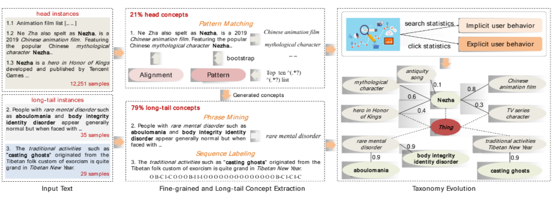 通常只从文本中抽取高频率、粗粒度和静态的概念实例。在实际应用中,其较难覆盖长尾和细粒度概念信息,且存在更新困难的问题。