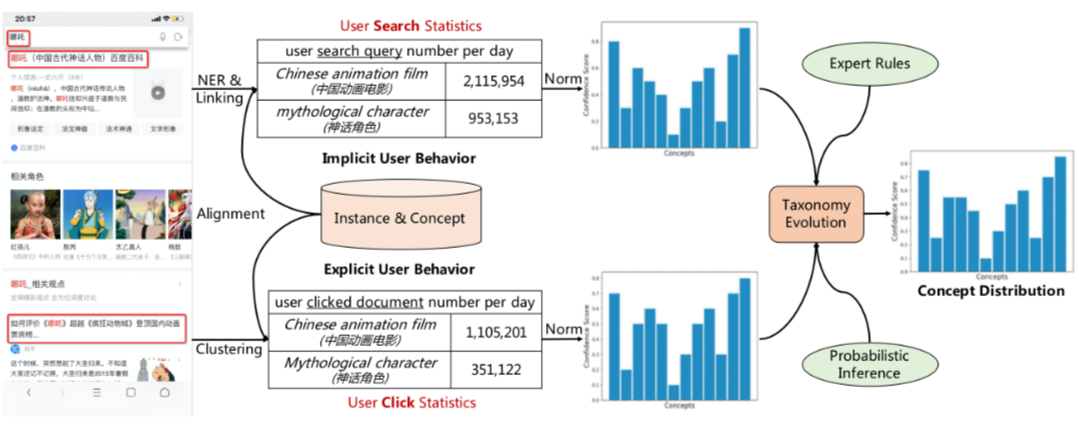 传统的方法无法随着时间的推移更新概念的信息。例如,“哪吒”在不同的时期有着不同的含义,可以指神话作品人物或者上映影片。因此,必须将时间演化纳入概念分类体系构建中。随着时间的变化,我们需要对齐概念图谱中具有相同含义的节点,并估计给定实例中概念的置信度分布。