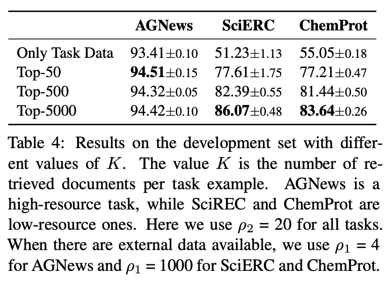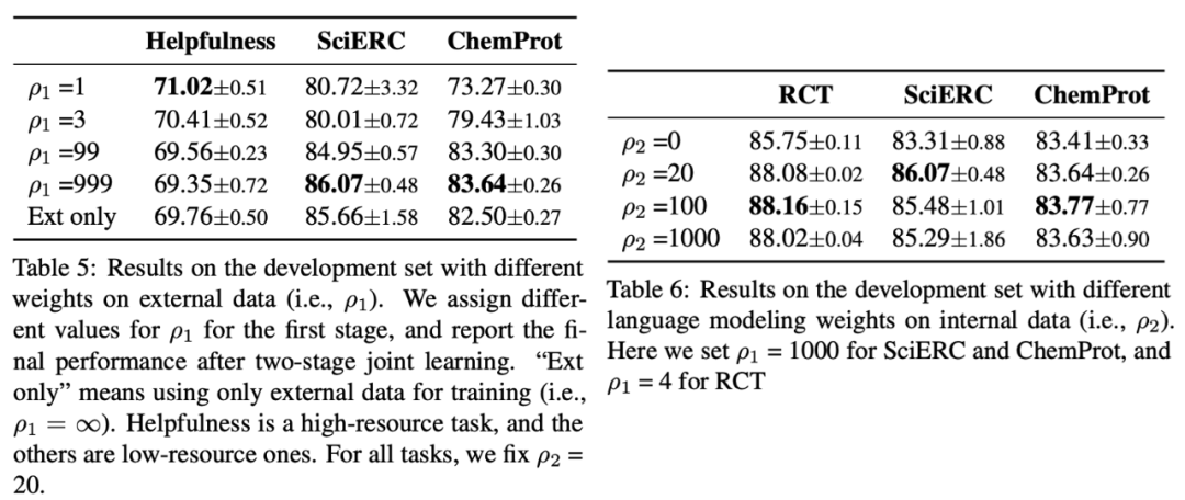 对于数据规模较小的任务(如ChemProt,SciERC),它需要召回相对更多的通用数据提供充足信息,同时赋予召回通用数据上的无监督训练目标更大的权重。