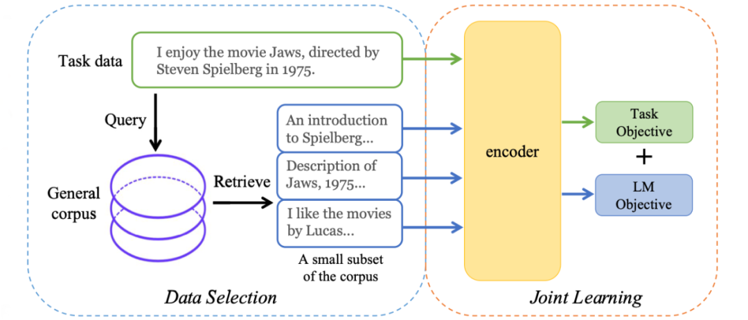 类似地,作者提出假设:预训练语言模型在特定任务上的性能,仅受益于大规模通用语料中仅与任务相关的部分,而不需要大规模的全量数据。