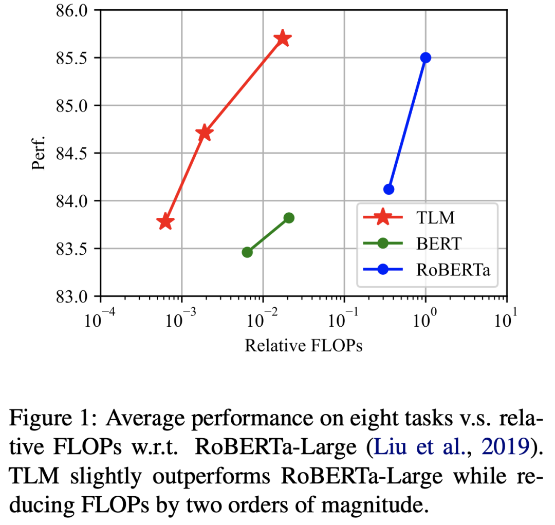 TLM框架无需进行大规模预训练,仅需要相较于传统预训练模型(例如 RoBERTa)约 1% 的训练时间与 1% 的语料, 即可在众多任务上实现和预训练模型比肩甚至更好的性能。