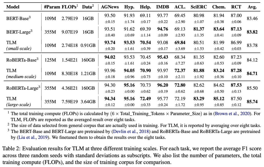 作者在8个自然语言分类任务上,从三个不同的规模分别开展了对比实验。这些任务涵盖了生物医药、新闻、评论、计算机等领域,并且覆盖了情感分类、实体关系抽取、话题分类等任务类型。