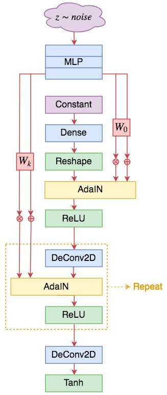 ▲ StyleGAN形式的DCGAN生成器。基于ResNet的也类似,大体的改动就是将条件BN换成AdaIN