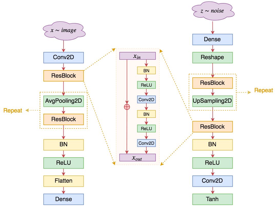 ▲ 基于ResNet的判别器架构(左)和生成器架构(右),中间是单个ResBlock的结构