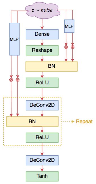 简单来说,它就是把条件 c 作为 β,γ 的条件,然后构成条件 BN,替换掉生成器的无条件 BN。也就是说,生成器的主要输入还是随机噪声 z,然后条件 c 则传入到生成器的每一个 BN 中。