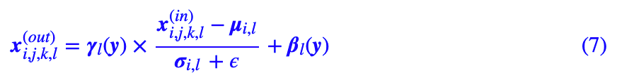 StyleGAN 的核心,是一个叫做AdaIN(Adaptive Instance Normalization)的玩意,来源于风格迁移的文章 Arbitrary Style Transfer in Real-time with Adaptive Instance Normalization [7]。它其实跟条件 BN 差不多,甚至比条件 BN 还简单: