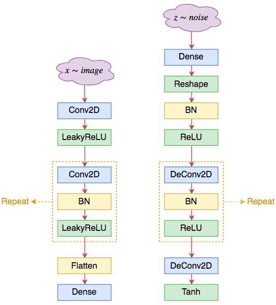 1. 生成器和判别器均不采用池化层,而采用(带步长的)的卷积层;其中判别器采用普通卷积(Conv2D),而生成器采用反卷积(DeConv2D);