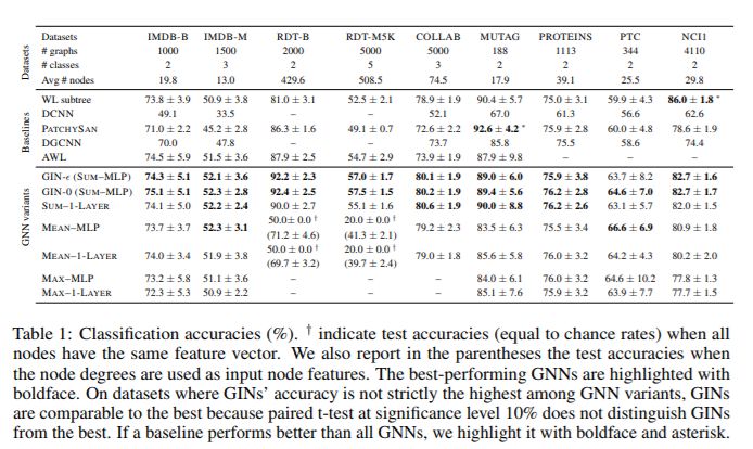 接下来,我们比较测试集精度。虽然我们的理论结果并不能直接说明 GNN 的泛化能力,但有理由期待具有较强表达力的 GNN 能够准确地捕获感兴趣的图结构,因此泛化能力非常好。表 1 比较了 GINs(SUM-MLP)、其他 GNN 变种以及最佳基准线的测试精度。