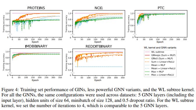 通过比较它们的训练精度,我们验证了 GNNs 的强大表征能力的理论分析。图 4 显示了具有相同超参数设置的 GIN 和不太强大的 GNN 变种的训练曲线。