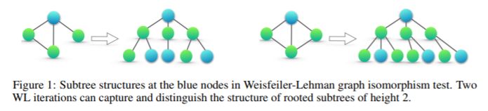 基于 WL 试验,Shervashidze 等人(2011)提出了 WL 子树内核来测量图之间的相似性。内核使用在 WL 测试不同迭代中的节点标签计数作为图的特征向量。直观的来看,在 WL 测试的第 k 次迭代中,一个节点的标签表征该根节点的高度为 k 的子树结构(Figure 1)。因此,WL 子树所考虑的图的特征本质上是图中不同根子树的计数。