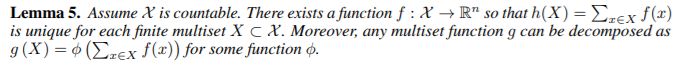 接下来,我们开发了一个可证明满足定理 3 中条件的模型,从而推广了 WL 测试。 我们将结果体系结构命名为 Graph Isomorphism Network(GIN)。为了模拟领域聚合的单射多重集函数,我们发展了一个“深多重集”的理论,即用神经网络参数化通用多重集函数。我们的下一个引理表明,求和聚合器可以代表多重集合的单射,事实上,是多重集上的通用函数。
