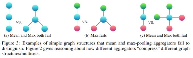 图 2 根据三个聚合器的表示能力对其进行排序,图 3 说明了平均池和最大池聚合器对结构对无法区分。在这里,节点颜色表示不同的节点特征,我们假设 GNN 在将它们与中心节点组合之前先聚合邻居。