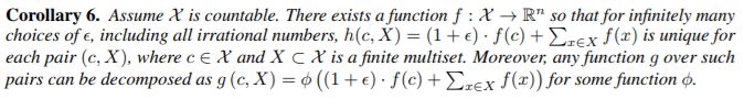 该引理扩展了设置 (Zaheer et al., 2017) 从集合到多重集。深多重集和集合之间的一个重要区别是某些单射集合函数,例如均值聚合器,不是多重集函数。利用引理 5 中通用多重集函数的建模机制作为构建块,现在我们提出一种聚合方案,可以表示节点对和其邻居的多重集合上的通用函数,从而满足定理 3a 中的单射性条件。 我们的下一个推论在许多这样的聚合方案中提供了简单而具体的公式。