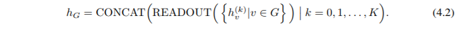 根据定理 3 和推论 6,如果 GIN 使用对来自相同迭代的所有节点特征求和来取代 Eq.4.2 中的 READOUT(在求和之前我们不需要额外的 MLP,原因与方程 4.1 相同),它可以推广 WL 测试和 WL 子树核。