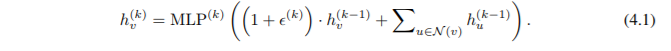由于通用逼近定理(Hornik 等,1989; Hornik,1991),我们可以使用多层感知器(MLP)来推导和学习推论 6 中的 f 和φ,在实际应用中,我们用一个 MLP 对 f(k+1) ◦ φ (k) 进行建模,因为 MLP 可以表示函数的组成。在第一个迭代中,如果输入特征是一个热编码,那么在求和之前不需要 MLP,因为它们的求和是单射的。我们可以制作一个可学习的参数或固定的标量。然后,GIN 更新节点表征如下: