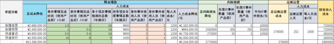 (1)降本=人力成本(发生频率*单个人效提升*人力单价)+ 其他节省(硬件成本降低+软件费用降低)