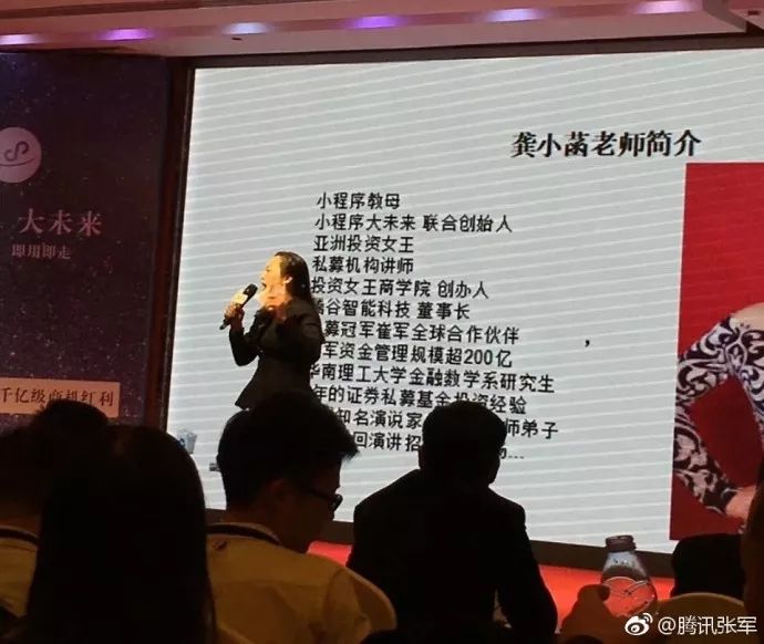 近日,一张某线下的照片在网上流传,图上一个女子在台上演讲,背后PPT上个人简介第一行赫然写着“小程序教母”几个字。腾讯公关总监@腾讯张军 也发微博吐槽:“我是不是应该去跪拜一下?”。
