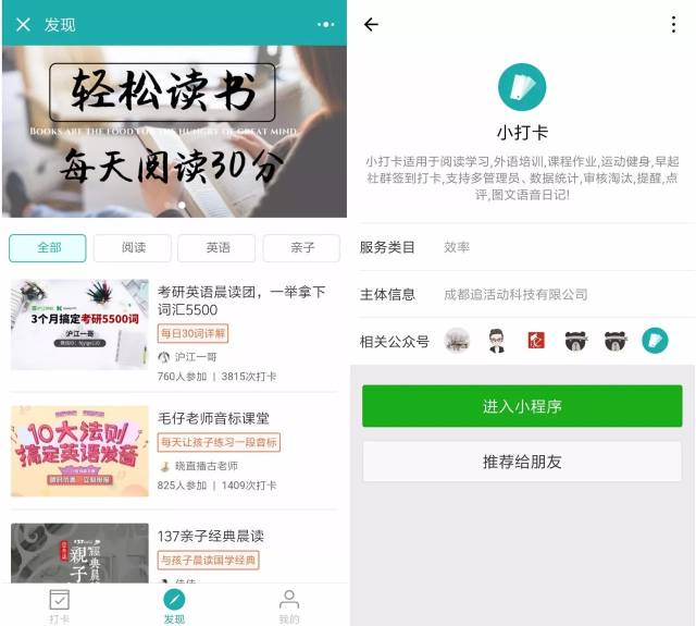 “小打卡”是一个习惯养成类小程序。用户可以加入阅读、培训、作业、早起、健身等多个兴趣社群,签到打卡。