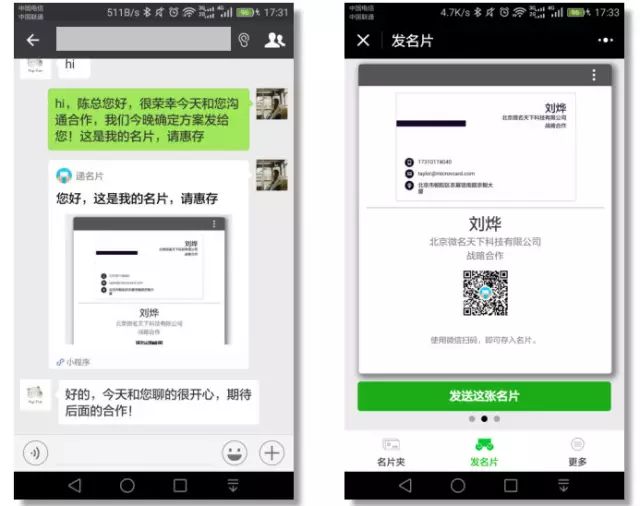 在商务场合,难免有交换名片,互通姓名的环节。然而,发纸质名片或是在微信中发送名片图等沟通方式效率太低,因此“递名片”得以在一个个换名片场景中自发地传播。