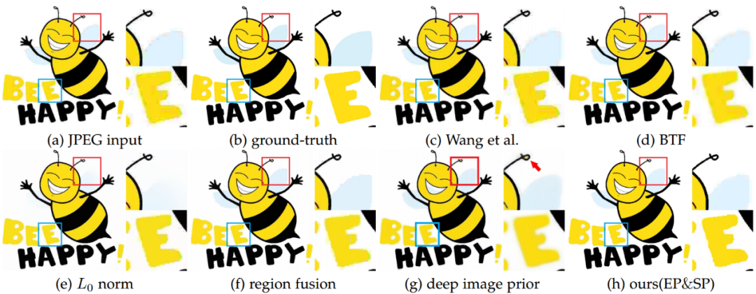 对于第二类任务,我们将算法应用于卡通图去压缩伪影,实验结果如图6所示。从结果中可以看出我们的算法对于锐化强边界和保持弱边界方面都有着很好的表现。